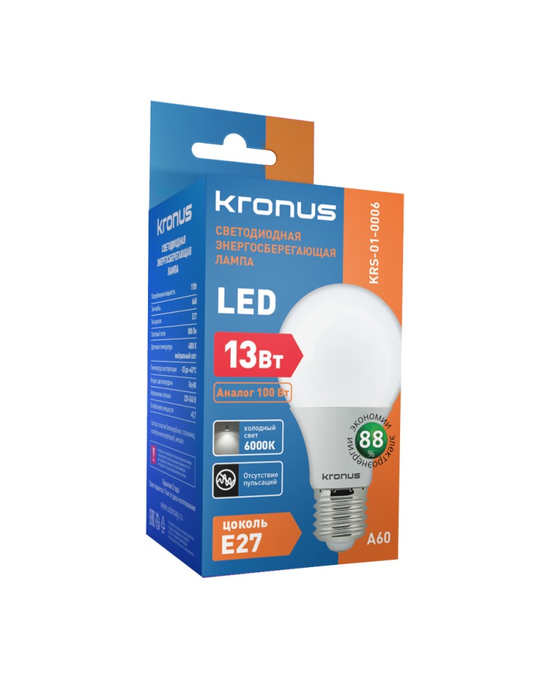 Лампа светодиодная KRONUS (LED) A60- 13W-6000K E27 Холодный Дневной свет (KRS-01-0006)