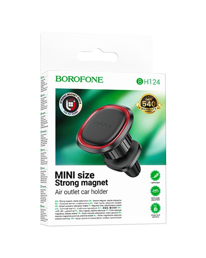 BOROFONE BH8 Air автомобильный держатель телефона для воздуховода, алюминиевый сплав с силиконовой площадкой, магнитный, маленький размер.¡. Материал изготовления: алюминиевый сплав.¢. Обработка: алюминиевый сплав + оксидирование + силиконовая площадка.£. Размеры: 33.5мм*30мм. Вес: 26 г.¤. Магнитный держатель.¥. Место крепления: воздуховод.